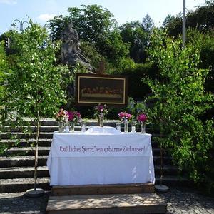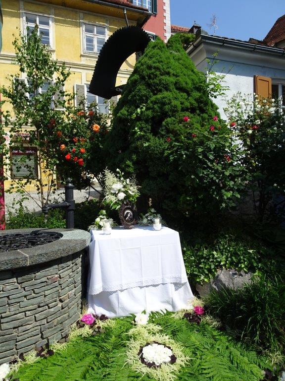 Am Beginn des Fronleichnamsfestes, dem "Hochfest des Leibes und Blutes Christi" stand ein festlicher Gottesdienst in der Pfarrkirche, zelebriert von Franziskanerpater Bernardin Schröder und  Pater Simon. Hernach folgte die feierliche Prozession mit einer Monstranz (Gefäß, in dem eine Hostie für den Leib Christi aufbewahrt ist) unter einem Baldachin zu den Stationen mit den liebevoll geschmückten 4 Altären im Römerpark, Vormarkt (Missionskreuz), am Taboraufgang und bei der Mariensäule am Hauptplatz, wo jeweils die Evangelien gelesen und der eucharistische Segen erteilt wurde.