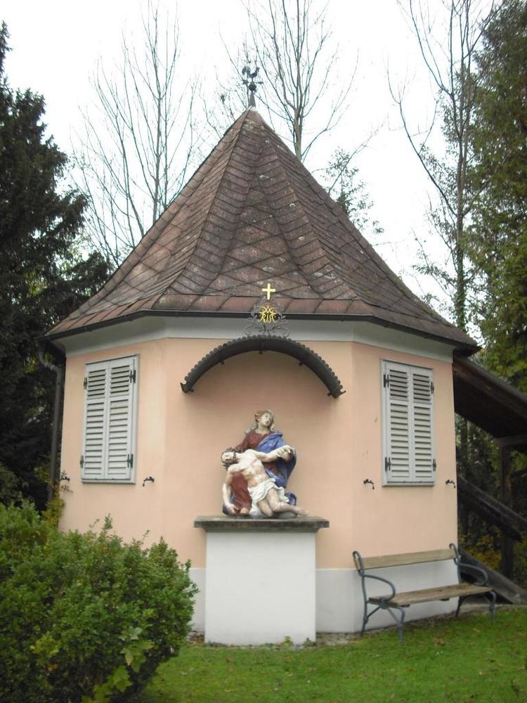 Am westlichsten Ende des Gartens befindet sich ein barocker achteckiger Pavillon aus dem 18. Jahrhundert. An der östlichen Wand dieses Bauwerkes steht auf einem Sockel unter einem gebogenen Dach eine farbige steinerne Pietagruppe, die aus der der Zeit um 1730 stammt und der zweifellos hohem künstlerischen Wert zukommt. Das schmucke Gartenhäuschen aus der Spätphase des Barocks zählt damit zu den älteren Gebäude der heutigen Stadtgemeinde. Die Pieta (italienisch: 'Frömmigkeit, Mitleid') ist in der bildenden Kunst die Darstellung Marias als Mater Dolorosa mit Leichnam des vom Kreuz abgenommenen  Jesus Christus.